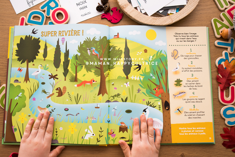 Il pourra s’utiliser tout au long de l’année, au fil des saisons, en présentant des paysages de la forêt, de la montagne, du jardin, du bord de mer, au du bord de la rivière. Les enfants sont invités à compter, réfléchir, résoudre des devinettes, répondre à des questions adaptées … Avec ce livre on apprend pleins de choses sur la nature, les plantes, les animaux, et on enrichit le vocabulaire.