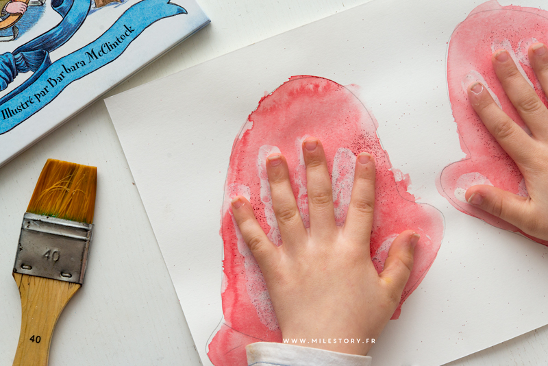 pour cette première peinture, on a tracé des moufles à suivant le contour de leur main.