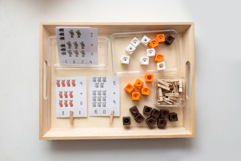 dans ces même fichiers il y a par exemple ce jeu d’additions et soustractions, que j’accompagne de nos cubes (pour rappel nous avons ce coffret de cubes (avec fiches d’activités), mais vous pouvez aussi juste prendre un lot de 100 cubes)