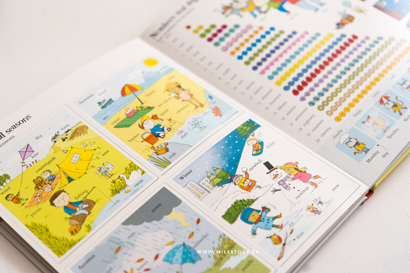 Pour commencer cette sélection, voici un grand livre cartonné avec de riches illustrations. On y aborde tous les thèmes (maison, couleur, forme, fruits, saisons, ….) il est donc très complet. Je l’utilise de plusieurs façon. Je peux leur demander de choisir une page et on passe un instant dessus, ou de me montrer /dire quel mot ils aimeraient connaitre en anglais. Je peux aussi leur d’écrire l’image en faisant des petites phrases et en plaçant les mots clés. Voilà quelques exemples d’utilisations, mais il y en a beaucoup d’autres 🙂 Les pages sont épaisses et conviennent bien aux petits. Imagier à retrouver ici.