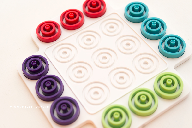 Qui n’a pas fait de parties de Morpion dans son enfance ? personnellement j’en garde d’excellents souvenirs d’école. Ici le principe est le même, mais en plus complexe tout en restant abordable pour les enfants, ce qui est super intéressant ! Il est indiqué à partir de 8 ans, mais on peut très facilement l’adapter pour y jouer avant, comme un morpion classique, en retirant par exemple des formes ou des couleurs. Puis en ajouter les autres éléments au fur et à mesure quand l’enfant est prêt. On peut donc dire que c’est un jeu évolutif.